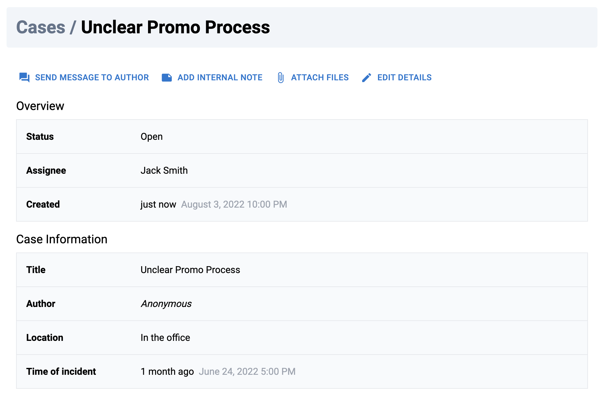View the "paper trail" for every case as it progresses from initial report to resolution.